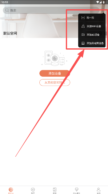 5、点击软件页面右上方的+选项,在随后展开的列表中选择设备连接方式。