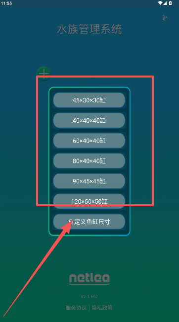 2、选择你正在使用的鱼缸尺寸,如果没有找到符合的请点击自定义尺寸进行编辑。