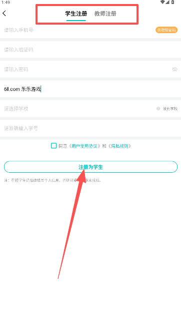 2、输入注册者的用户身份信息,点击注册为学生/老师。