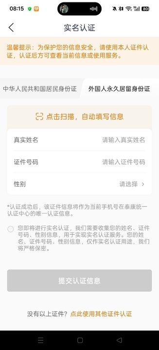 3、查询必备条件需要:中华人民共和国居民身份证或是外国人永久居留证,如果没有该证件证明,可以选择上传其他证件完成查询。
