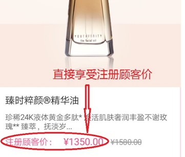 1、第一:成为注册顾客直接享受注册顾客价。比如以下面的精华油为例,直接购买价格是1580元, 成为注册顾客之后的价格是1350元, 白花花的省掉230元, 可以买好几个粉刷了。