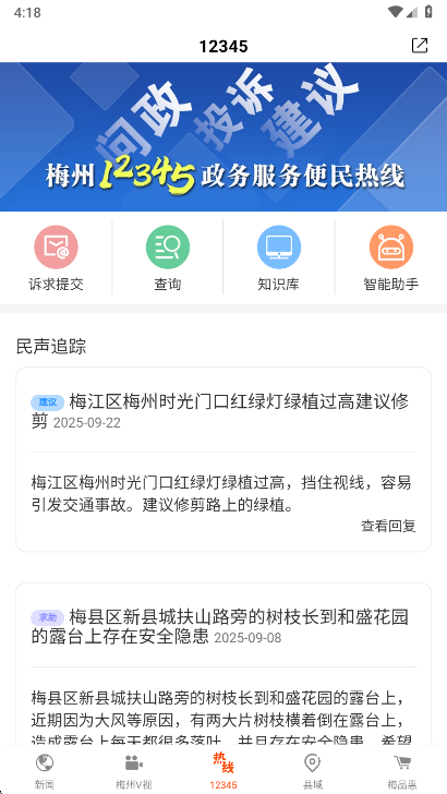 3、同时也是为梅州提供了12345热线电话,可以在这里提交诉求