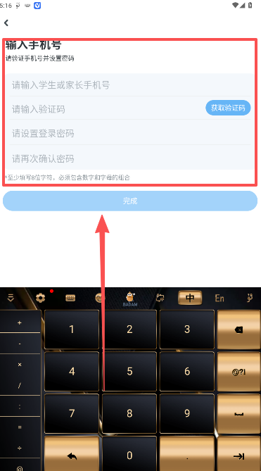 6、继续完成当前页面的信息输入,填写家长手机号码短信验证点击完成。