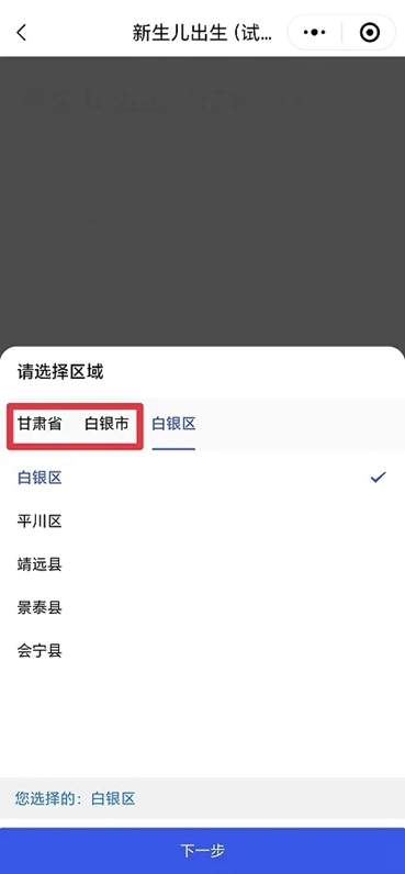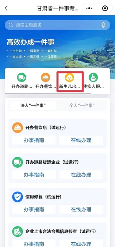 1、点击甘快办APP新生儿出生(试用行)版块。