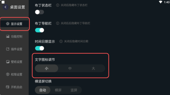 第一步:打开布丁UI系统设置--桌面设置--显示设置,在显示设置页面下滑,即可看到【文字图标大小调节】,默认的文字图标是最小号