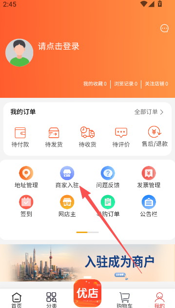 1、进入铸源优品app个人页面,点击商家入驻。