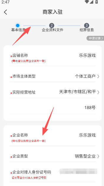 3、输入商家入驻所需要的个人及企业信息部分。