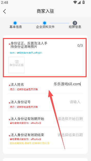 4、提交商家企业入驻所需要的资料文件相关信息,填写完整后进入结算信息部分,点击结算步骤完成最终的商家入驻。