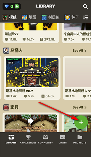 进入应用后,首先可在素材库中浏览各类模组、地图、材质包、种子和皮肤等资源,比如查看每日上新的模组,如“罂粟花玩乐时光V6”“方的红石洞穴”等,挑选感兴趣的素材。