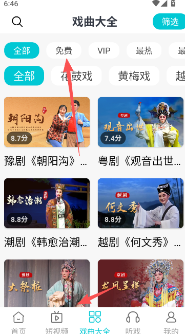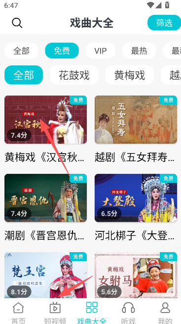 1、梨园行戏曲软件有将能够听的戏剧分为免费和VIP的的标签分类,用户在点击播放戏曲的时候,可以根据筛选分类来听戏曲。
