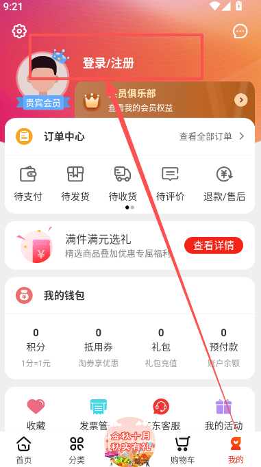 2、点击用户头像旁的登录/注册。