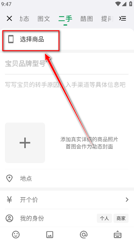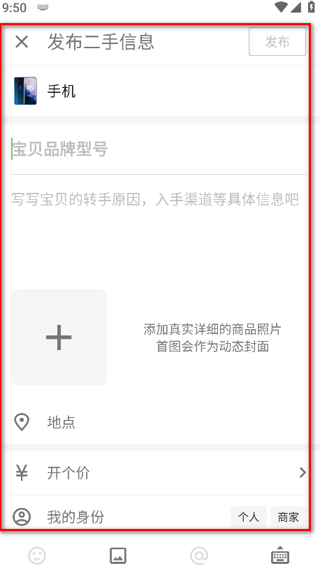 6.再输入自己的宝贝品牌型号、宝贝的转手原因、添加真实详细的商品照片、选择地点、开个价、选择我的身份,然后再点击发布即可。