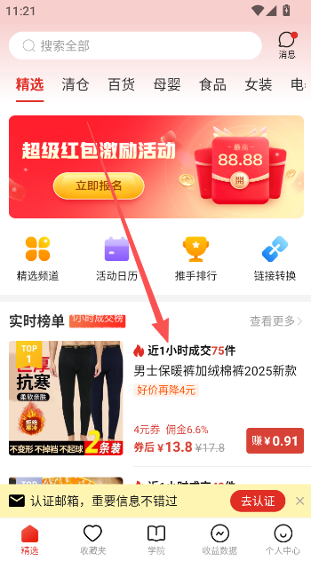 2、软件首页为大家精选佣金赚取的下单商品,可根据自己对于佣金比例的估算去下单购买。