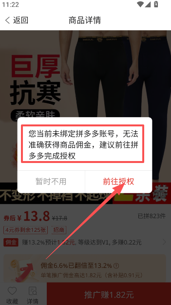 3、来到商品详情界面,有说明提示,需要授权绑定拼多多以后,才能够在下单以后,获得商品佣金。