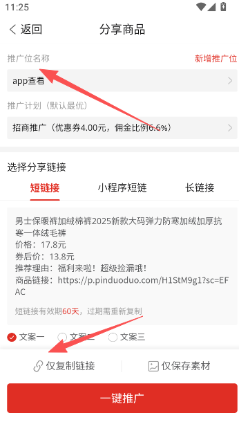 7、选择推广名称,推广计划,分享链接以及文案的方式进行推广发布,发布完成后将所发布的内容截图给商家,等待佣金回款。