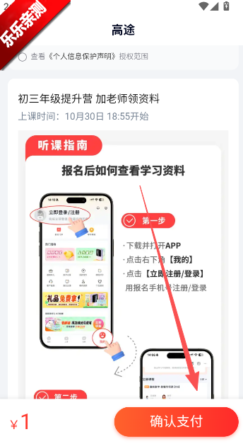 7、仔细查看课程学习方法以及领课程的方式,了解完毕以后点击确认支付。