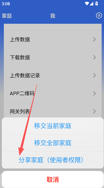 2、点击权限分享列表中的最后一项:分享家庭使用者权限。