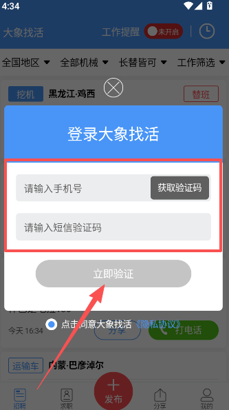 1、点击大象找活登录区,输入手机号以及短信验证码快捷注册进入。