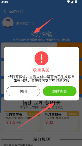 4、积分购买方式默认为微信,如显示购买失败,请按照框内提示咨询客服后继续购买。