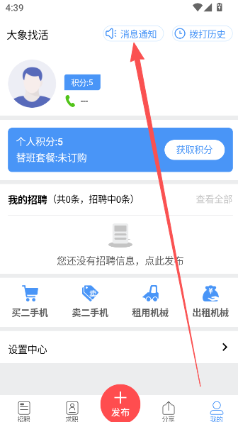 1、大象找活系统通知,可通过我的页面点击上方消息通知进行设置。