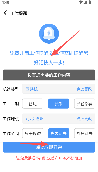 2、设置用户本人需要的工作类型,确保信息无误以后选择下方的点此立即开通。