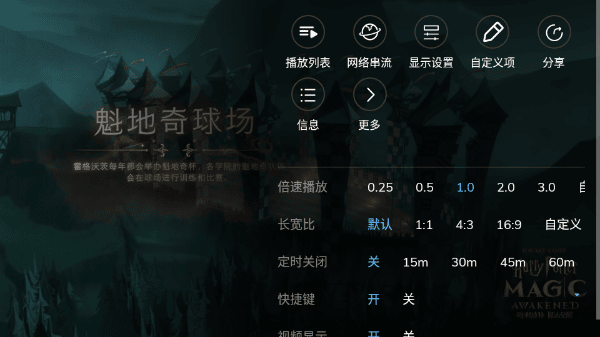 播放过程中点击菜单键会弹出操作菜单,在“显示”一项中包含了常用的显示设置。如屏幕方向、触摸动作和屏幕显示信息等。用户还可以设置跳转时间间隔及拖动支持的操作。