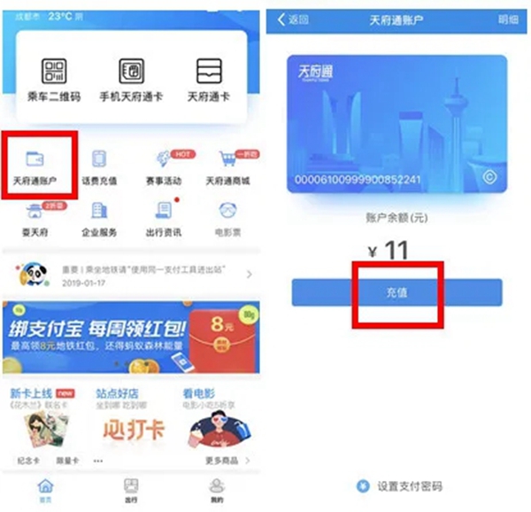 2、在主页点击打开天府通账户,点充值根据提示完成充值,或是直接用账户余额乘车。