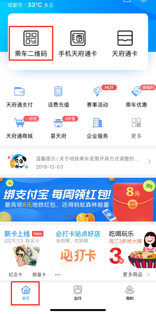 4、完成支付绑定后,点击“首页”中的“乘车二维码”。乘坐公交车或地铁时,将乘车码置于刷码设备处完成刷码,即可乘坐。