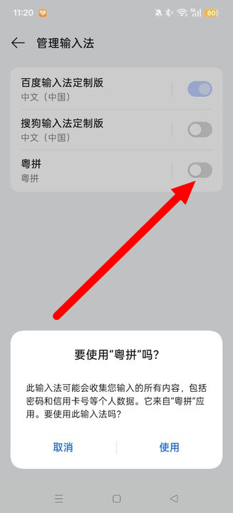 2、将手机系统内的输入法更改为粤拼输入法,点击确定使用。