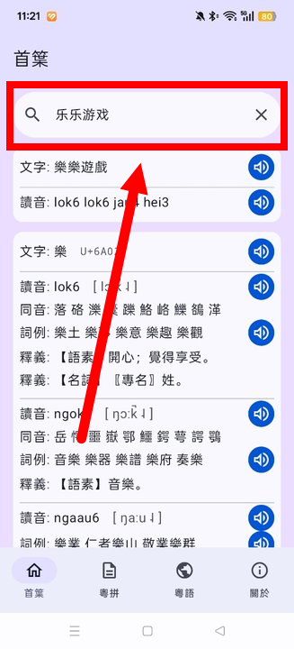 3、返回标题菜单首页,在空白区域内输入搜索内容,点击查看它的粤语文字以及发音。