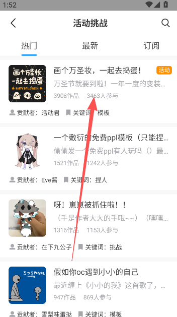 7、点击挑战活动频道的活动,选择一个符合上色主题的,比如马上快要到的万圣节。
