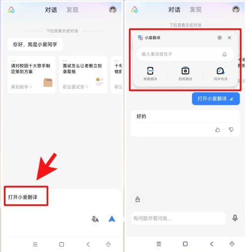 1、第一步启动只需通过语音唤醒小爱同学,并发出指令「打开小爱翻译」,即可一步进入功能主界面。之后就可以开始使用各种翻译功能。