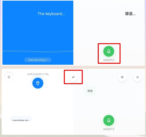 5、选择同声传译,界面会一分为二,按住你所在一侧的麦克风按钮说话,即会自动播放翻译语音。界面还可以反转,方便你将手机递给对方进行翻译