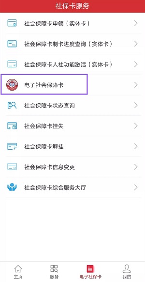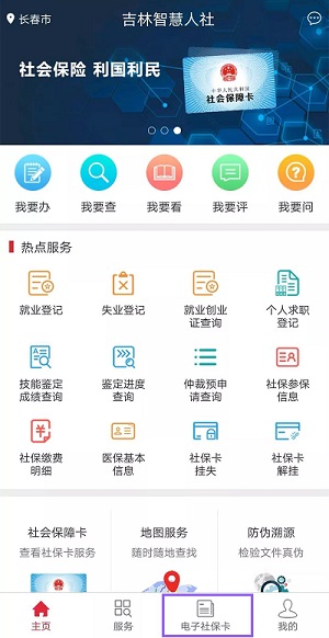 登录”吉林智慧人社“手机APP,点击”电子社保卡“选择”电子社会保障卡“选项