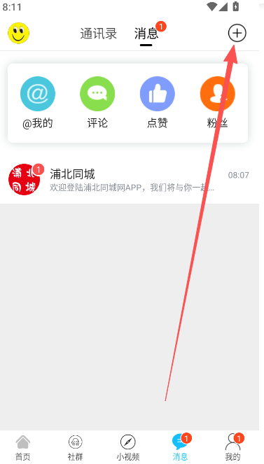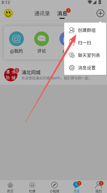 1、浦北同城网群聊创建,需要在用户注册登录以后,在消息页点击上方+列表展开。