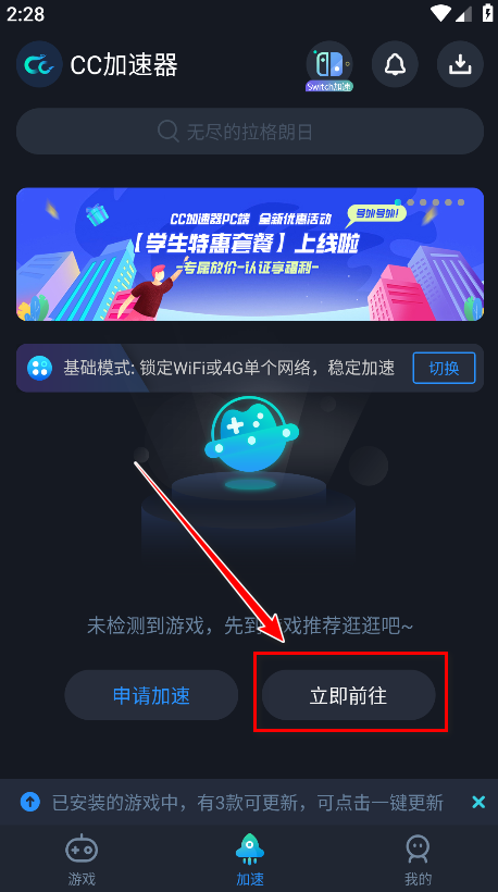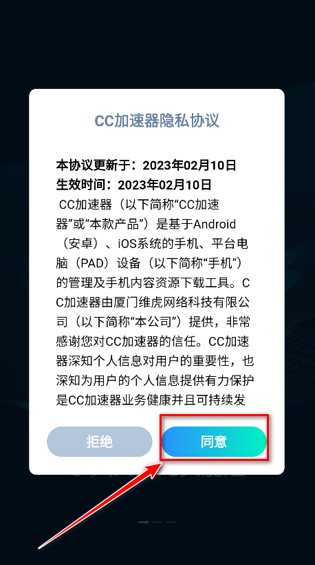 2、打开CC加速器:启动CC加速器应用,完成必要的授权操作,如同意用户协议、授权网络访问权限等。
