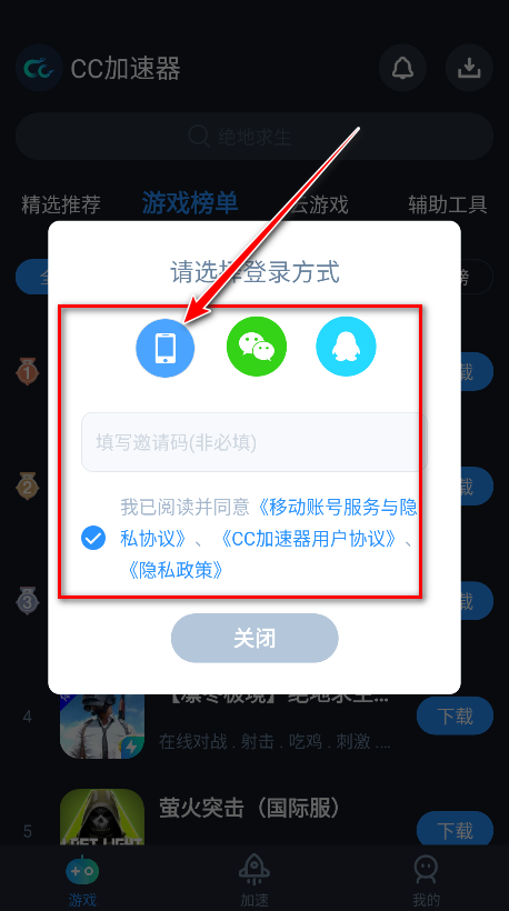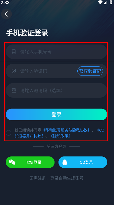 7.请输入手机号码、验证码,勾选我已阅读并同意《移动账号服务与隐私协议》、《CC加速器用户协议》、《隐私政策》,再点击登录。