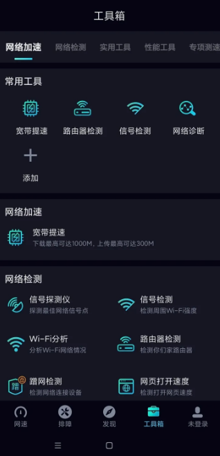 2、在工具箱网络加速这一板块中可以进行宽带提速,下载最高可达1000M,上传最高可达3000M