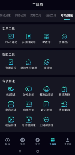 4、在专项测速这一板块中可以进行5G测速、游戏测速、云游戏测速、直播测速、电商测速、购票测速、资讯测速、视频测速、抢红包测速、上网课测速、搜索测速等十一项功能