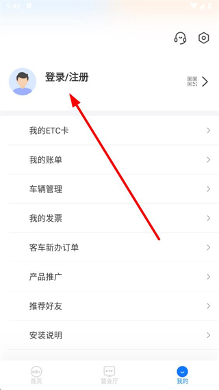 2、在我的页面,点击登录注册区域,进入登录页面。