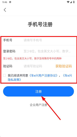 4、在手机号注册页面,填写手机号、登录密码,获取并输入验证码,勾选同意协议后点击注册按钮,完成注册操作。