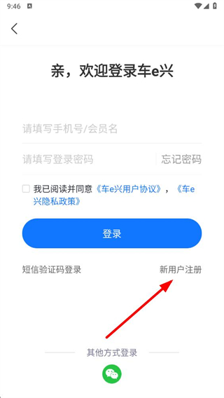 3、在登录页面,点击新用户注册选项,进入手机号注册页面。