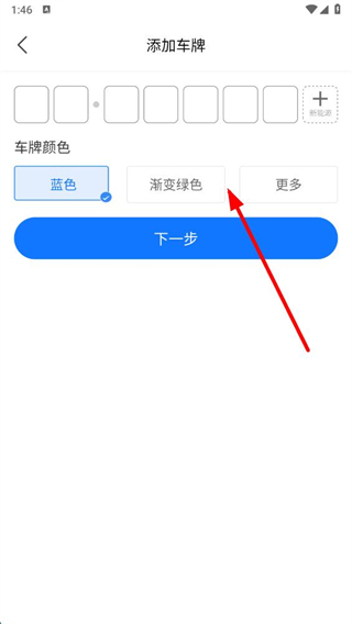 4、在添加车牌页面,输入车牌信息并选择车牌颜色,点击下一步按钮,按照提示完成车辆添加操作即可。