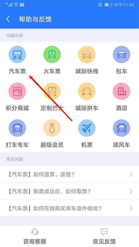 2、进入帮助与反馈界面,选择左上方“汽车票”图标,