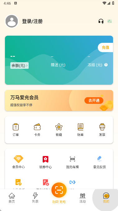 5、在我的个人中心版块,您可以开通万马爱充会员以及查看余额