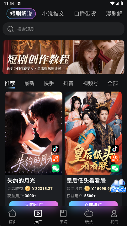 2、您可以选择选择您要推广的功能,不管是小说,还是文章短视频都是可以的,这里以短剧为例进入