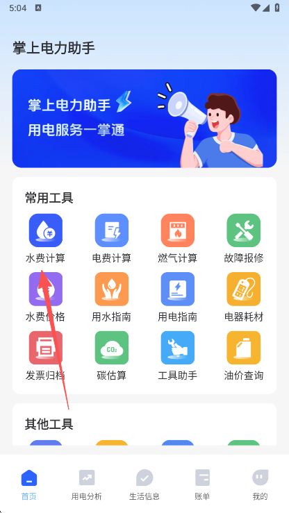 1、在本站下载安装掌上电力助手app打开,进入首页即可看到水费计算功能