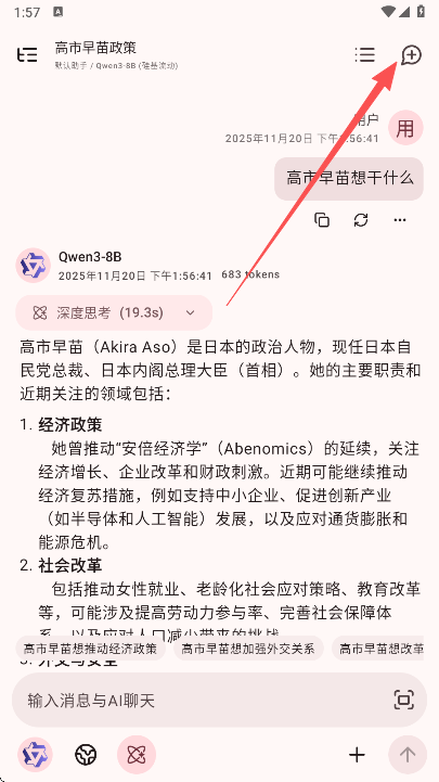 1、我们询问完上一个问题后, 可以点击右上角的+号开启新对话