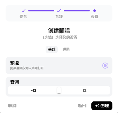 5、上传的是仅人声的清唱,勾选上预混。音调方面,如果男声模型翻唱女声歌曲,可以适当调低一些音调,反之则调高;这里我们用默认即可。