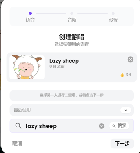 2、这里会弹出一个对话框,输入你选择的音色名称,例如:Lazy sheep,因为这是国外的平台,里面的模型大多数都是以英文命名的,所以需要我们用英文去搜索,点击下一步。